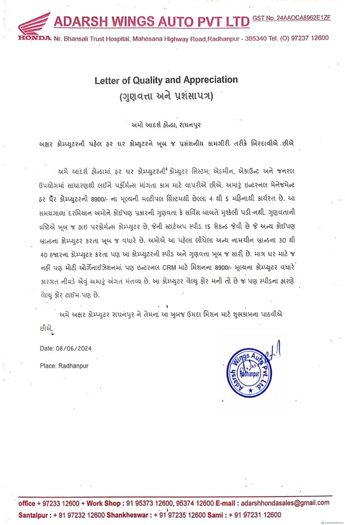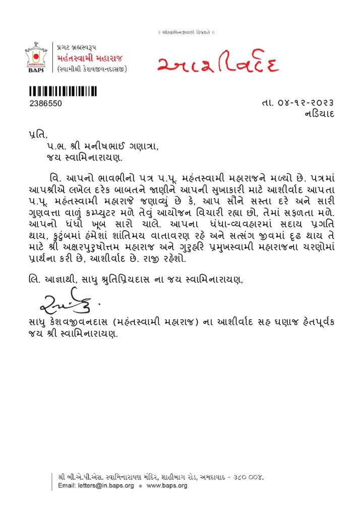 હર ઘર કોમ્પ્યુટર મિશન ને BAPS વૈશ્વિક સંસ્થા ના આધ્યાત્મિક ગુરુ હરિ શ્રી મહંત સ્વામિ મહારાજ ના અંતર થી આશીર્વાદ પ્રાપ્ત થયા છે